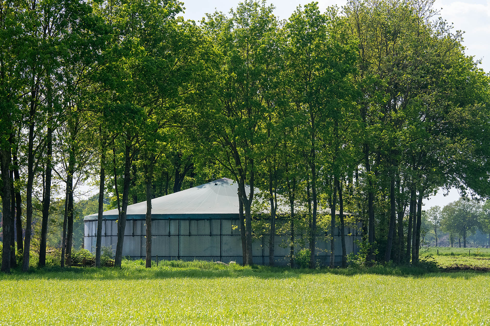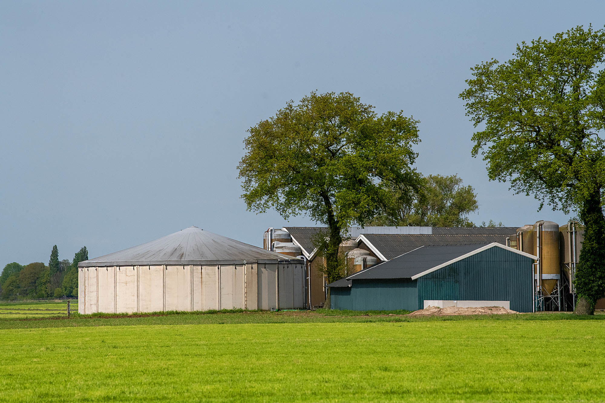 Bij bijna alle stallen zie je dat mest wordt opgeslagen in silo's.